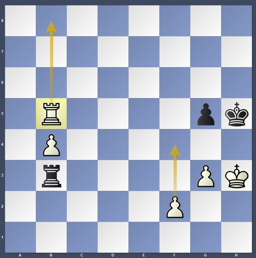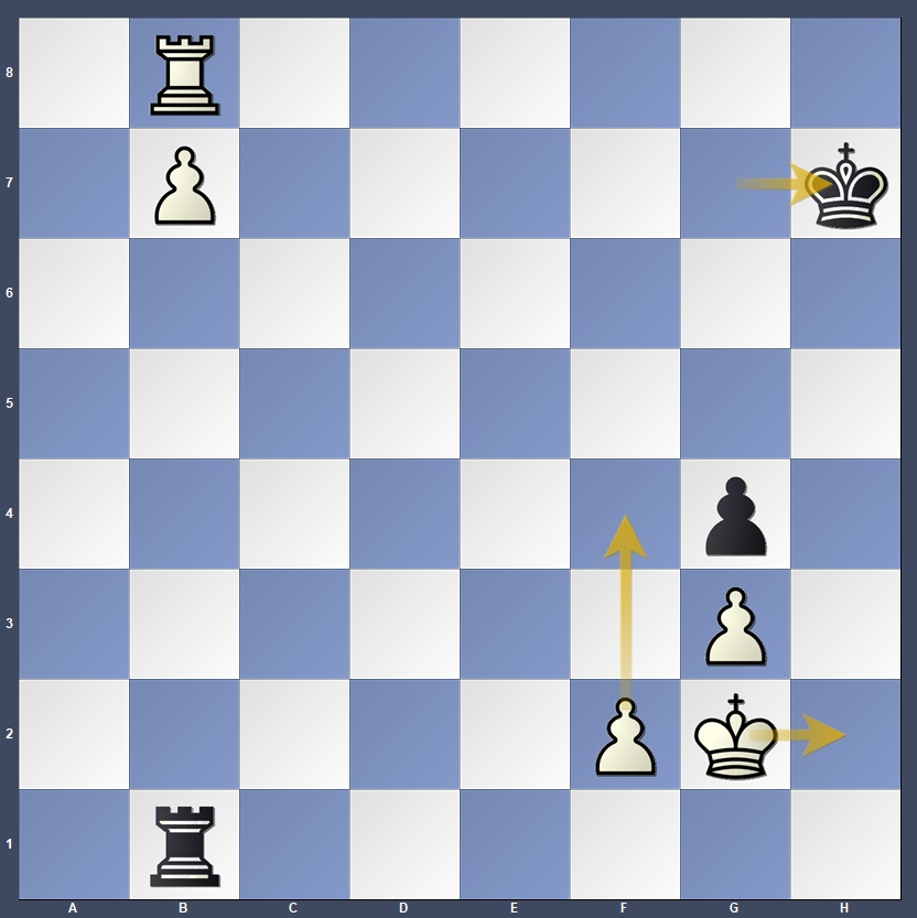 Alternatively, if 60… Rb2 we use triangulation to transfer the turn to the opponent with 61.Kg1 Rb1+ 62.Kg2 and the position is zugzwang. Now, if Black moves the king to g7, then we pick up the g-pawn as before, and if Black waits with 62…Rb2 then 63.Kf1! and we head out into the open with the king with a winning ending. Not so easy!