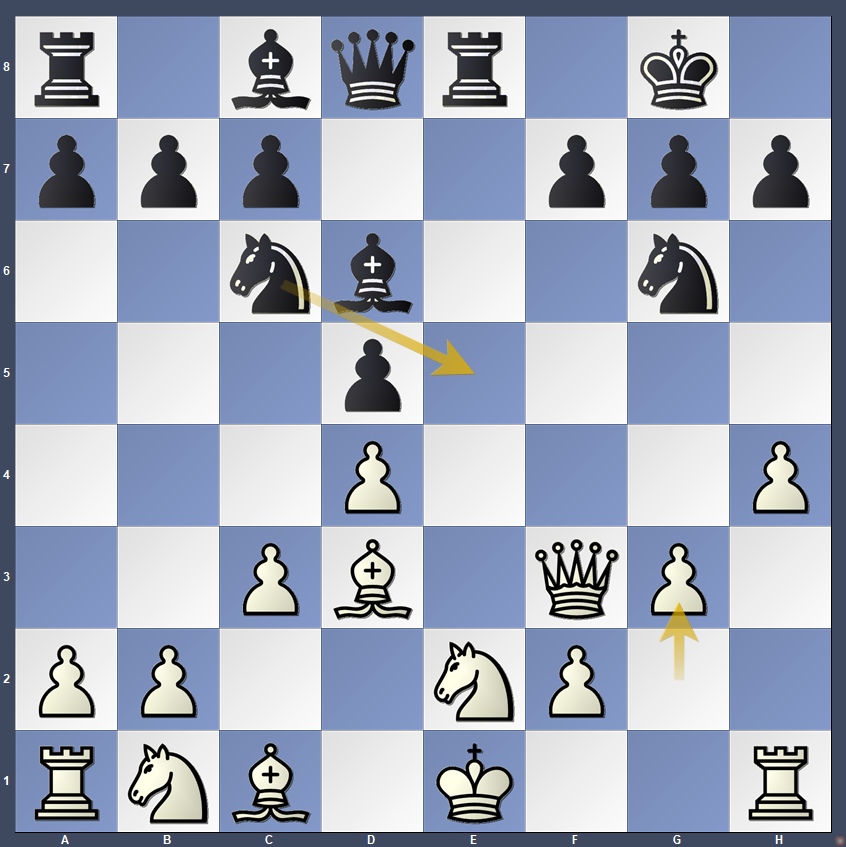 After 11.dxe5 Nxe5 (another fork), 12.Qxd5 Be6! followed — a developing move that renewed the attack by targeting the overloaded queen. When White retreated with 13.Qe4, Erdogmus continued energetically with 13…f5!, and after 14.Qe3, he had already foreseen the decisive 14…Bd5!, simultaneously attacking the rook on h1 and threatening 15…Nf3+ winning the queen.