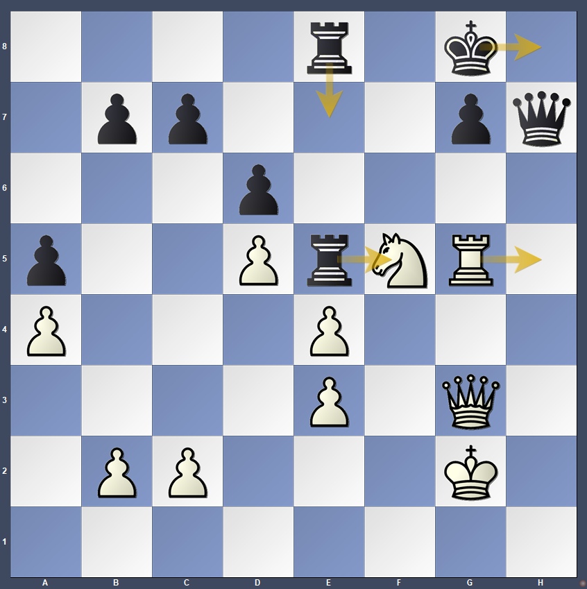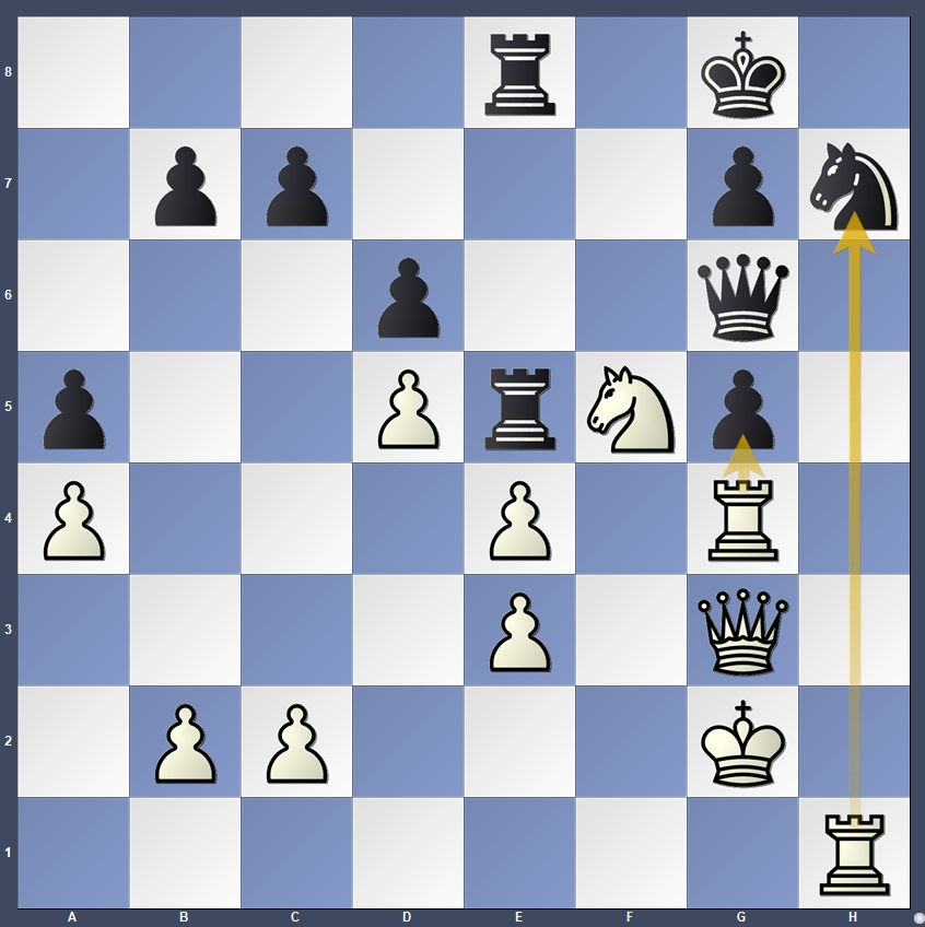 Sarana, usually a model of precision, faltered under pressure with 34…Kh8?? (both 34…Rxf5 and 34…Re7 would have held). Van Foreest pounced immediately with 35.Rh5!!, trapping the queen and forcing resignation after 35…g6 36.Qxg6.