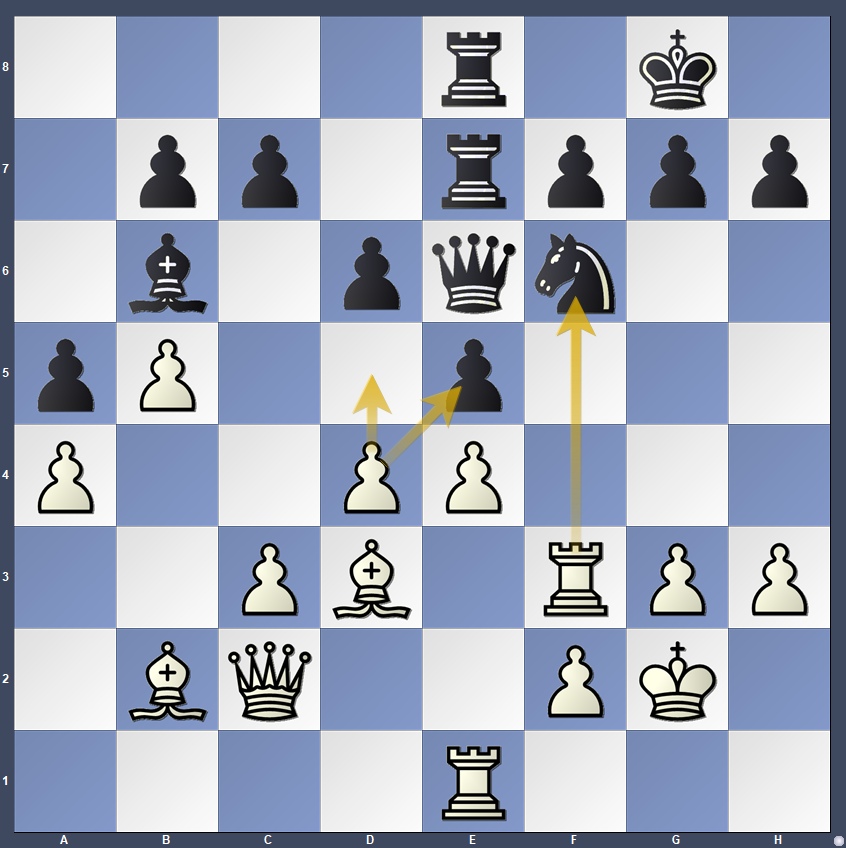 However, the engine indicates that White had an even more ambitious and powerful option: 28.d5!, after which …Qd7 is met with the stunning 29.Rxf6!, sacrificing the exchange to launch a direct assault on Black’s castled king. There is no immediate forced win, but after 29…gxf6 30.Qd2, White’s pieces pour toward the kingside, and the resulting initiative is enormous.