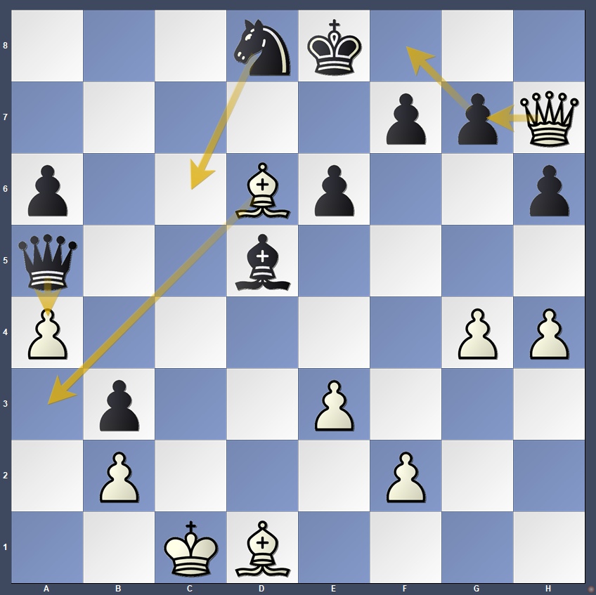 Instead, the only move to stay afloat was 29…Qxa4. Crucially, after that, 30.Qxg7 would no longer work due to the interposing 30…Qc6+, winning for Black.