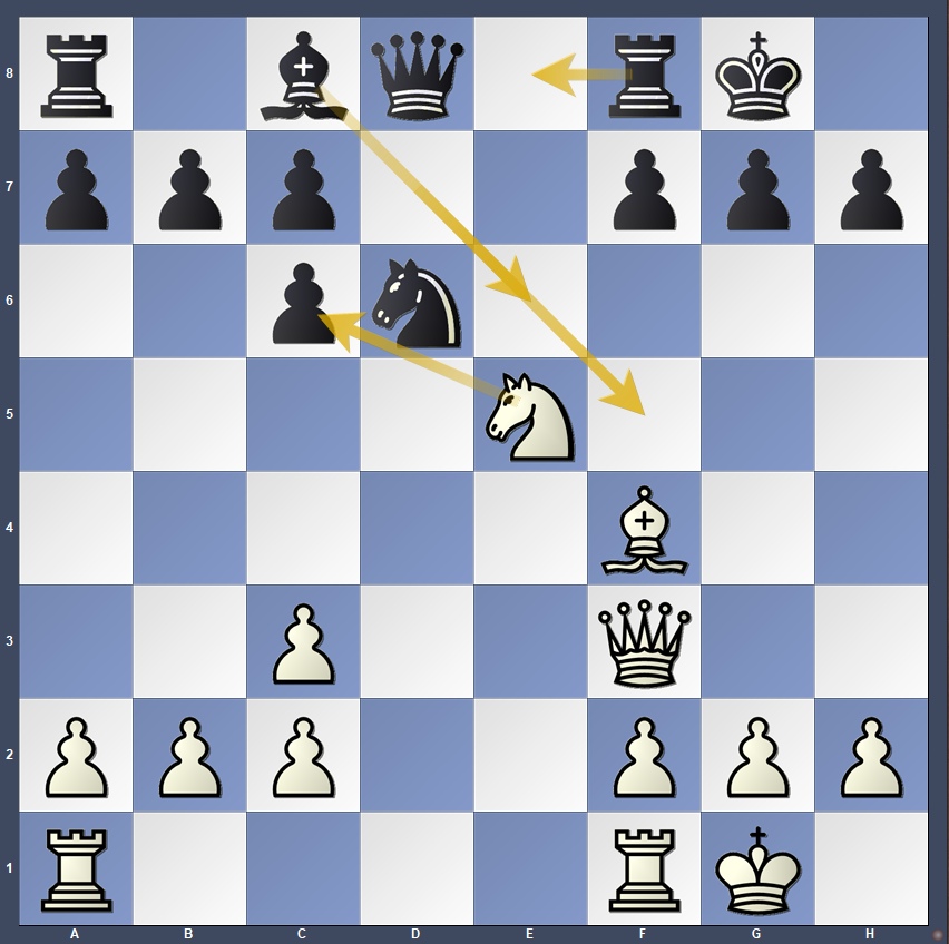 A bolt from the blue that stunned the playing hall and left spectators murmuring in disbelief. White wins a clean pawn, as after 11…bxc6 12.Bxd6 the bishop on f5 falls.