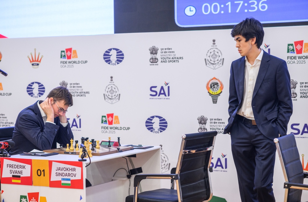 The three remaining games all reached move forty and headed into extra time. The first of them to conclude, and the one that confirmed another Uzbek qualification, was GM Frederik Svane (2638) drawing his game against GM Javokhir Sindarov (2721).
